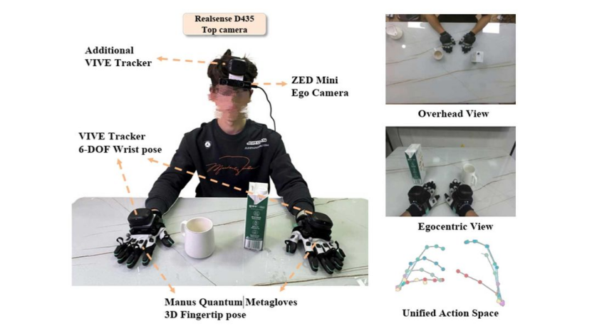 研究团队采用 Manus 数据手套,以毫米级精度实时捕捉每只手25个关键点的三维位置。相比传统基于摄像头或VR头显的方案,该系统不受遮挡、光照或空间限制影响,支持在多样化的现实环境中灵活部署。