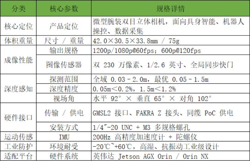 ZED X Nano延续了 ZED双目3D相机家族的技术路线,针对机械臂末端集成进行了深度优化:
