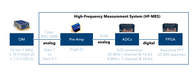 XARION 检测系统(High-Frequency Measurement System, HF-MES)包含的几个主要组件:光学麦克风(OM)、前置放大器(Pre-Amp)、A/D转换器(ADCs)和现场可编程门阵列(FPGA)。这个系统用于实时频谱分析,可以提供高达33000个频谱/秒的采样速度。