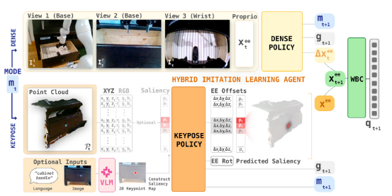 HOMER框架的核心优势在于"混合动作模式":机器人可自动切换关键姿势(适配长距离移动)与密集动作(适配精细操作),将复杂协调任务交给全身控制器处理。