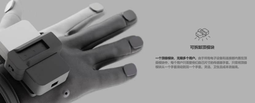 可拆卸顶部模块:电子元件集中于此模块,可快速在不同尺寸的传感器手套间切换,实现多用户、 hygienic、低成本运营。