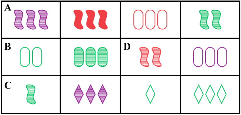 Set游戏规则要求从12张卡牌中选出符合规则的三张牌,研究者通过控制机器人动作序列(参数c表示所选牌与解决方案的接近度,f表示符合规则维度数)来模拟不同失败情况。