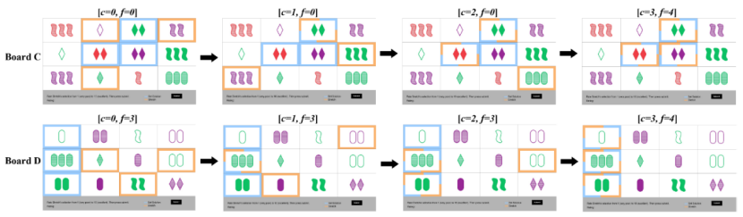 我们用机器人动作序列预定义,以展示c和f的渐进变化。例如,在部分序列中,机器人逐步接近解决方案,但规则符合度波动,这帮助观察参与者的反馈策略差异。