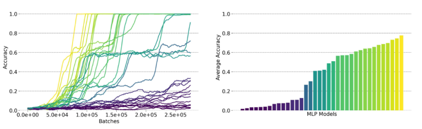 通过模拟训练MLP模型测试不同策略效果,结果显示:不同策略下的模型准确率差异巨大(平均62.9%,标准差41%),部分策略导致模型几乎无法学习,而某些策略(如高权重c和f)则带来快速学习。