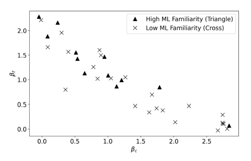 图6: 参与者线性回归系数图,标注ML熟悉度,展示策略多样性